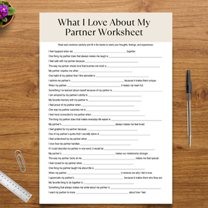 Are you looking for a meaningful way to express appreciation and strengthen your relationship? The What I Love About My Partner Worksheet, Couples Communication, Trust & Emotional Awareness is designed to help couples reflect on the qualities, memories, and everyday moments that make their relationship special.